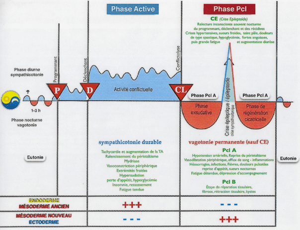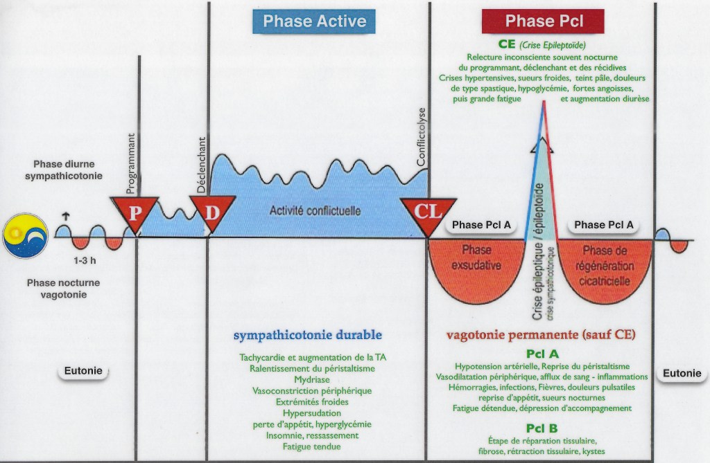 On parle de conflit biologique lors d’un tel choc qui vient s’« ancrer » dans le corps, mettant en jeu ce que l’on appelle la « triade psychisme-cerveau-organe ».[7] L’évolution est synchrone, précise et constante entre le conflit au niveau psychique, organique et cérébral dès l’instant du choc.