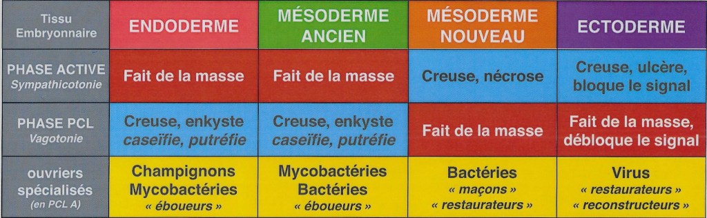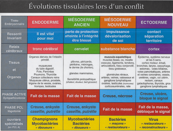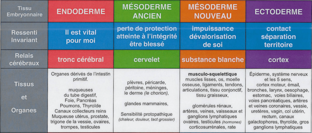 Chaque feuillet embryonnaire est en correspondance avec un relai cérébral (foyer de Hamer), un organe correspondant et un type de structure histologique caractéristique.