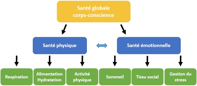 Ce tableau récapitulatif montre comment la santé de chaque individu dépend de sa santé physique et émotionnelle, qui sont ici divisées par soucis de compréhension, mais sont en fait indissociables puisque corps et émotion sont intimement liés. La santé globale est conditionnée par les cinq composantes présentées en vert.